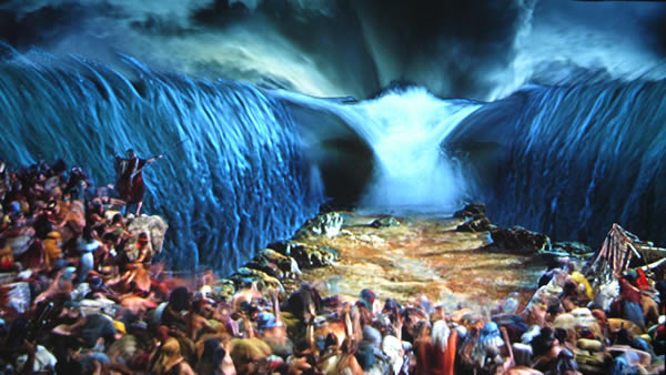 もっとも有名なシーンです。モーゼが両手を高く掲げると、紅海が二つに割れ、海の中に道が出てくるシーンです。