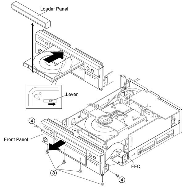 上図にあるように①~④のネジを外すことによって簡単に内部にアクセスすることができます。ただし実際には、"Loader Panel" は外すことなくFFC を引き抜いて "Front Panel" を取り外しています。