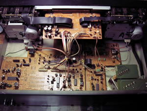 カバーを取り外すと、2台のカセット駆動ブロック(メカブロック)と基板類(エレキ部)が見て取れます。